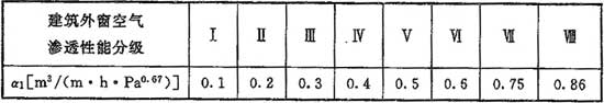 式中:α1——外門(mén)窗縫隙滲風(fēng)系數[m3/(m·h·pab)],當無(wú)實(shí)測數據時(shí),可根據建筑外窗空氣滲透性能分級的相關(guān)標準,按表F.0.3采用;